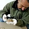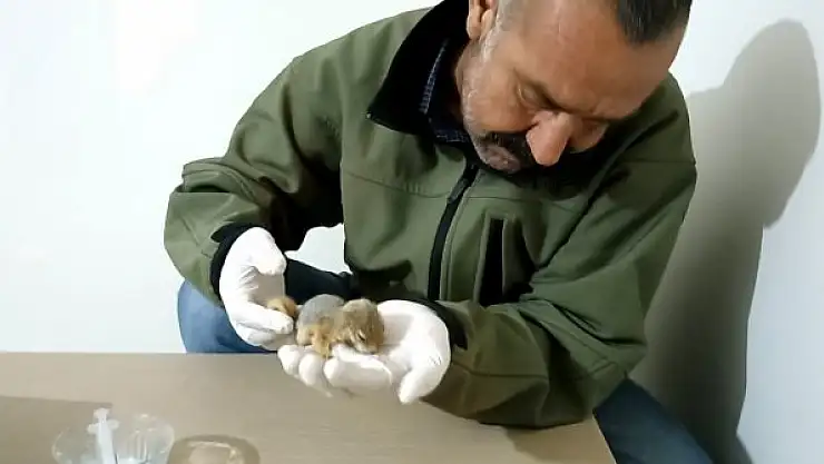 Adıyaman'da annesi otomobilin altında kalarak ölen yavru sincap görevliler tarafından şırınga ile besleniyor.