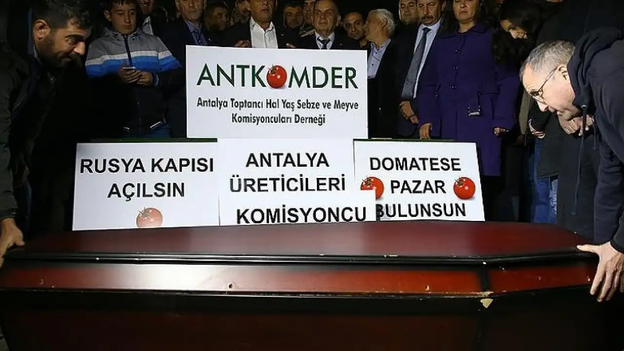 Sabaha karşı halde buluşan oda, dernek başkanları, üretici ve komisyoncular basın toplantısı düzenledi. Grup, "Rusya kapısı açılsın", "Domatese pazar bulunsun", "Komisyoncu üretici el ele" yazılı dövizler açtı.