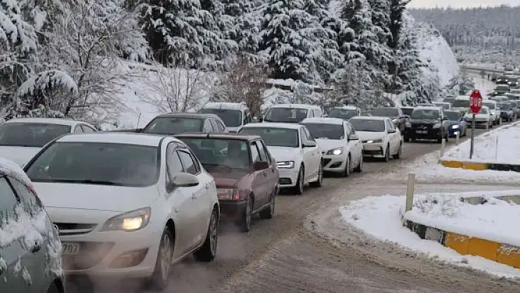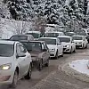 Denizli'de etkili olan kar yağışının ardından Antalya karayoluna zincirsiz ve kar lastiksiz gelen sürücüler uzun araç kuyruğu oluşturdu.