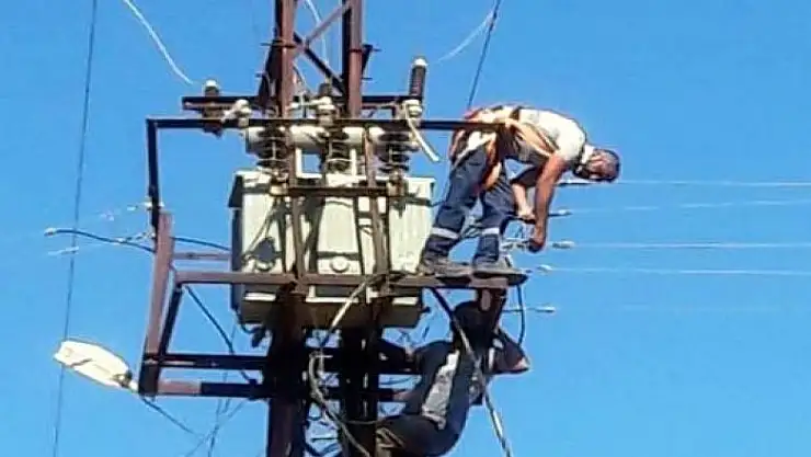 Antalya'nın Manavgat ilçesinde enerji nakil hattı ihalesini alan yüklenici firma işçisi, elektrik akımına kapıldığı direkte mahsur kaldı.