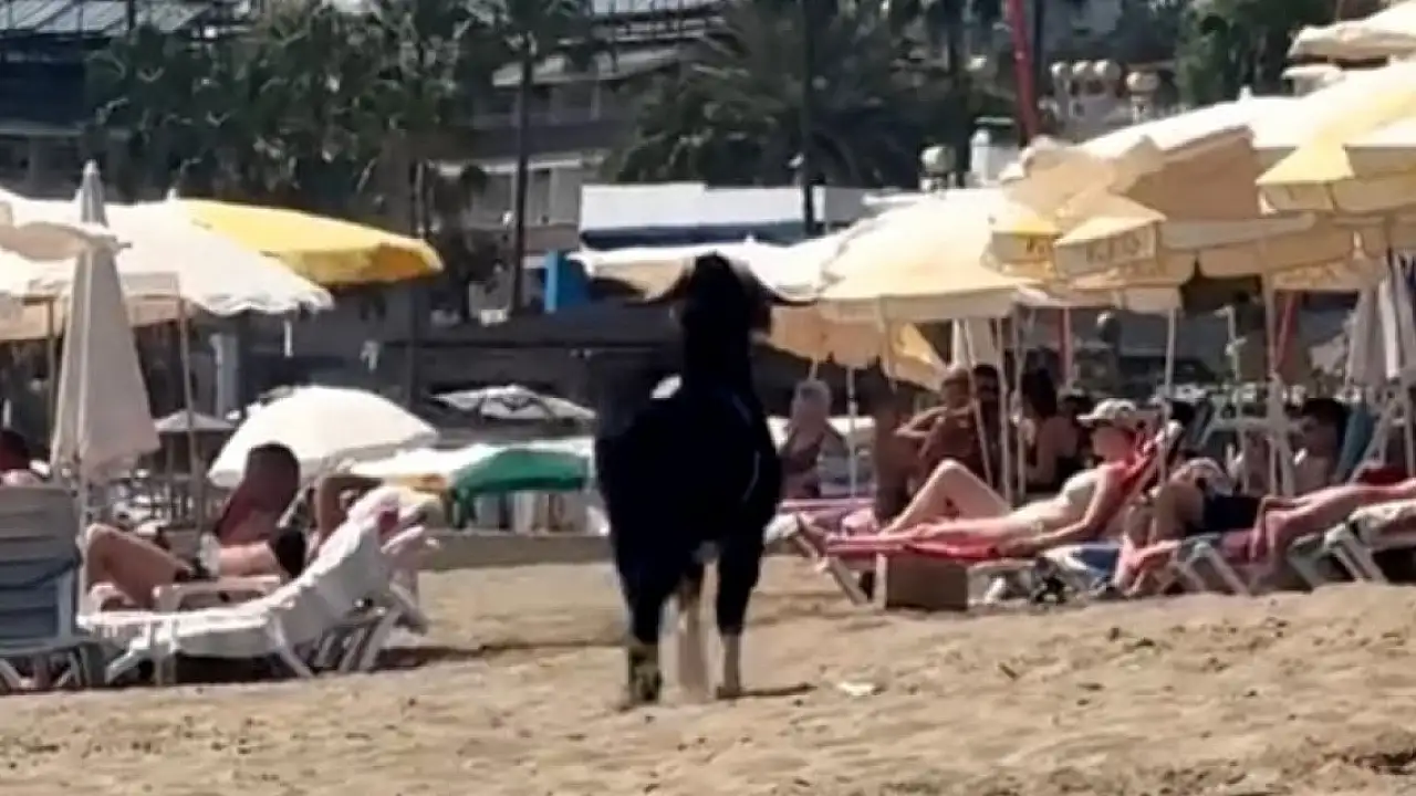 Antalya'nın Alanya ilçesinde kesilmek üzereyken kaçan kurbanlık keçi, Kleopatra Plajı'na girdi.