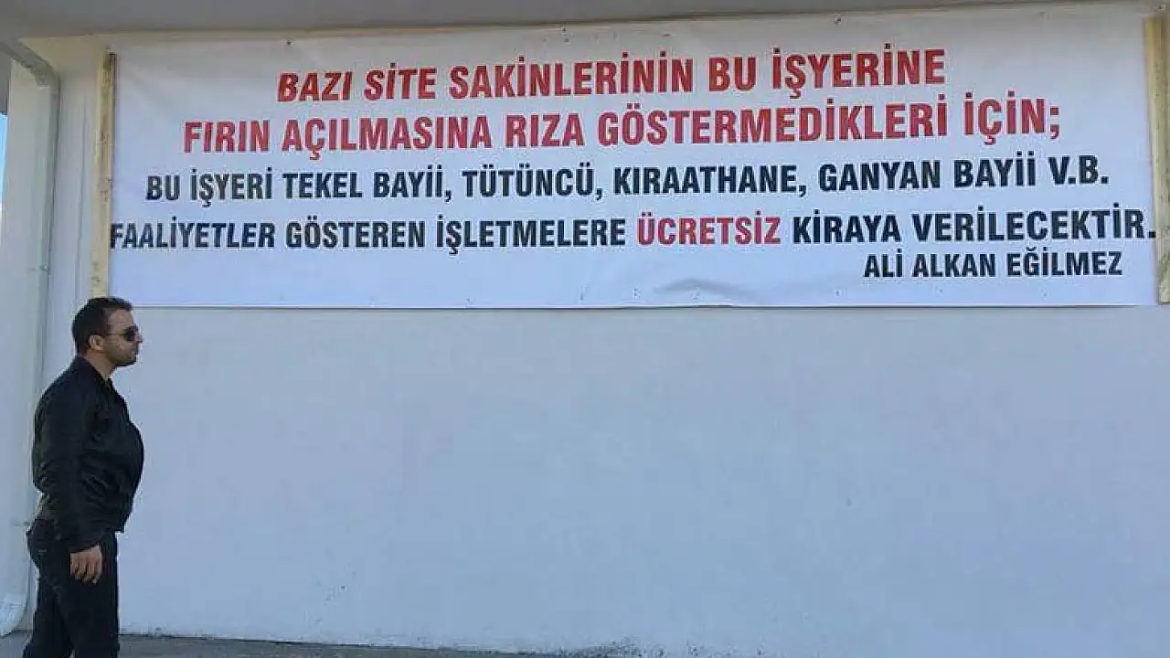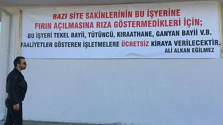 Karaman da müteahhitlik yapan Ali Alkan Eğilmez tapusu kendisine ait bir iş yerine fırın ruhsatı almak için site sakinlerinin izin vermemesine sinirlenerek herkes tarafından konuşulan o pankartı işyerinin duvarına astı. Yazdığı pankartta bazı ticari faaliyetlerde bulunacak esnaflara ücretsiz, hiç kira almadan kiraya verileceğini duyurdu. Pankartı okuyanlar hayretler içinde kaldı.