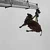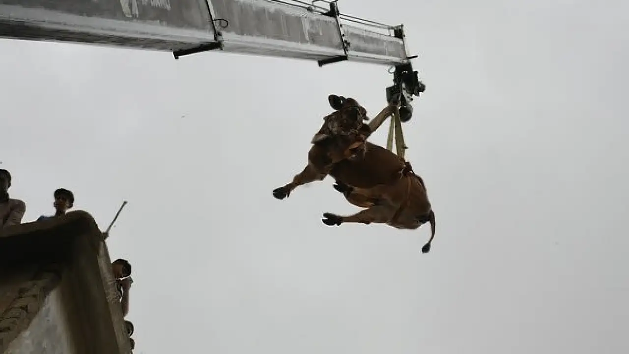 Pakistan'ın Karaçi kentinde bazı besiciler, Kurban Bayramı öncesinde evlerinin çatısında besledikleri kurbanlıklarını vinç yardımı ile indirerek kurban pazarına götürüyor.