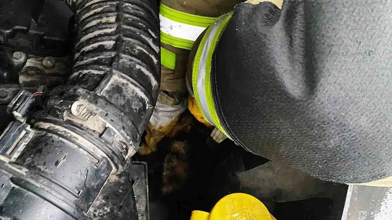 Balıkesir'in Bandırma ilçesinde Levent Mahallesinde araç motoruna sığınıp mahsur kalan kediyi itfaiye kurtardı.