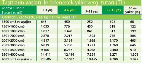 Motorlu taşıtların 2017 yılı motorlu taşıtlar vergisi ödemeleri başladı. Birinci taksit Ocak ayı sonuna kadar, ikinci taksit ise Temmuz ayı içinde ödenecek. Dileyen tek seferde de ödeme yapabiliyor. Ülkemizde motorlu taşıtlar vergisi, yaş ve silindir hacmi ile ilişkili olarak belirleniyor.