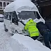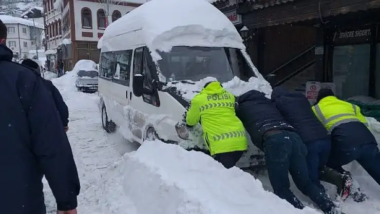 Kastamonu'nun Küre ilçesinde kar yağışı sebebiyle yollarda kalan araçları, polis ekipleri vatandaşlarla birlikte iterek çıkardı.