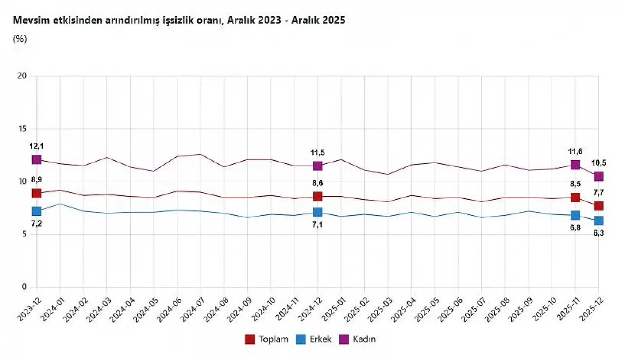 Türkiye'de işsizlik oranı, Aralık 2025'te bir önceki aya göre 0,8 puan azalışla yüzde 7,7 olarak tespit edildi.