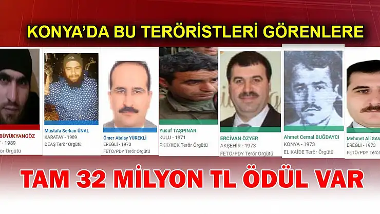 İçişleri Bakanlığı Arananlar listesindeki Konyalı teröristler de yer alıyor. Konya doğumlu teröristler listesinde Kırmızı listeden 1 kişi, mavi listeden 2 kişi yeşil listeden de 8 kişi bulunuyor. 3 listedeki kişiler için toplam ödül 32 milyon lira olarak belirlendi.