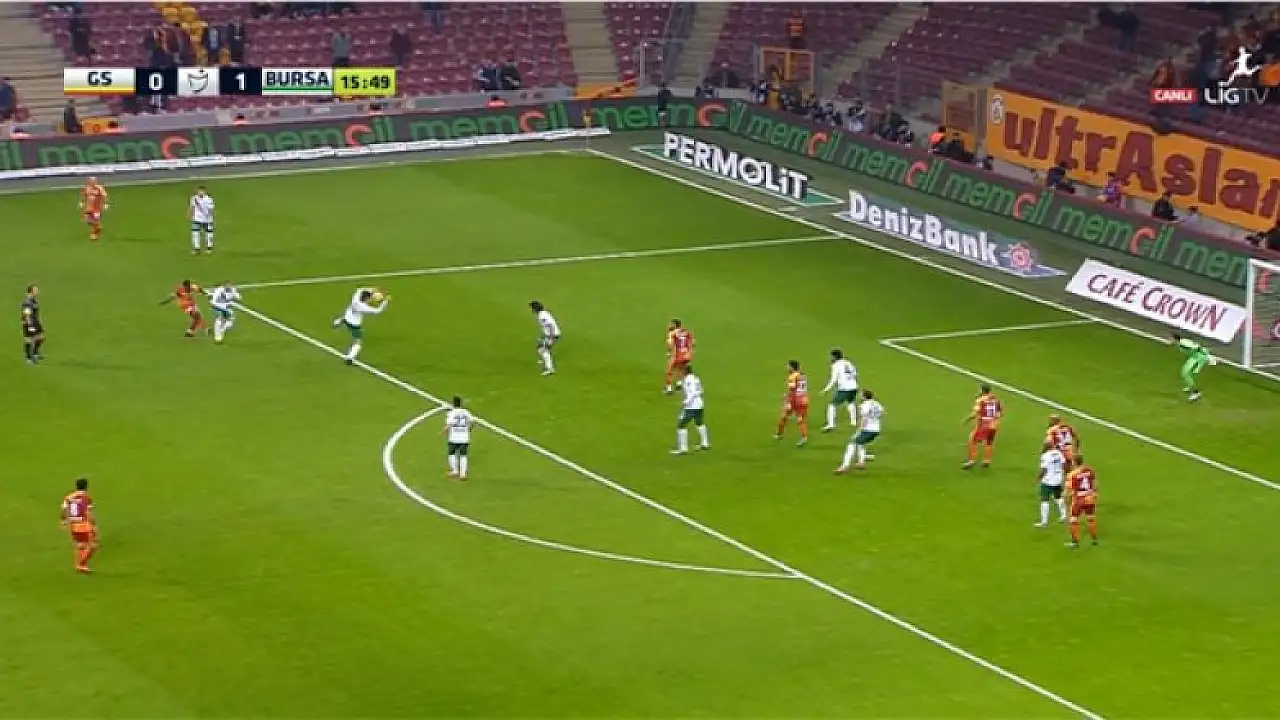 Bursasporlu Kubilay'ın golünde Galatasaraylı futbolcuların ofsayt beklediği an.