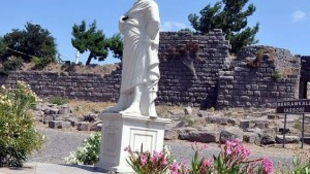 Alınan bilgiye göre, 6 yıl önce Kültür ve Turizm Bakanlığının girişimleriyle Assos'a dikilen ve 2,5 metre boyundaki mermerden heykele henüz kimliği belirlenemeyen kişi ya da kişilerce zarar verildi. Heykelin sağ kolu kırıldı, yüzü tahrip edildi.