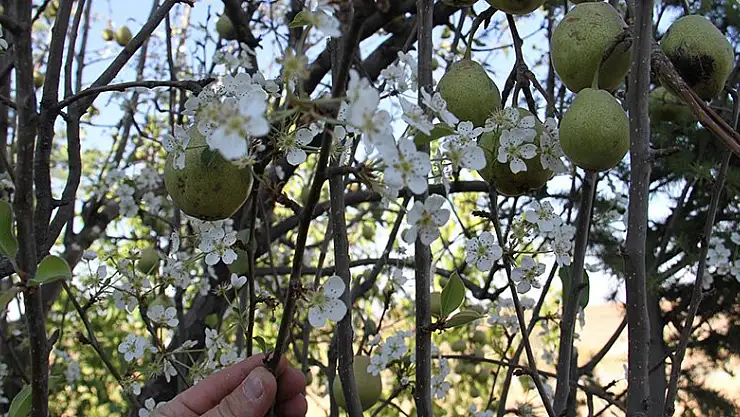 Mermer fabrikasının üretim sorumlusu Mevlüt Badem, 14 yıldır çalıştığı fabrikanın bahçesinde Eylül ayında bahçede enteresan bir durumla karşılaştıklarını dile getirerek, "Hiç görmediğimiz farklı bir durum ve olay oldu burada. Armut ağacında, bir yanda armut bir yanda çiçek. İkisi aynı anda. Diğer ağaçlarımız da böyle bir durum söz konusu değil. Ağacın her tarafı çiçek, armuttan çok çiçek var diyebiliriz" diye konuştu.