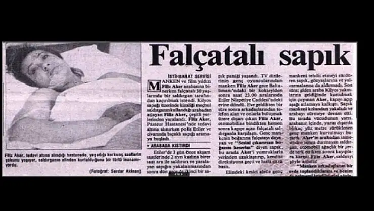 Tarih 19 Şubat 1990... Milliyet gazetesi'nde yer alan bu fotoğrafta Hastane yatağında görülen kadın Filiz Aker'den başkası değil. Manken ve film yıldızı Aker, Kilyos yolunda 30 yaşlarında bir saldırgan tarafından kaçırılmak istendi. Saldırganın kullandığı arabadan atlayan Aker, ağır yaralandı.