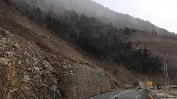 Yaklaşık 1 saat ulaşıma kapalı kalan yol Karayolları ekiplerinin çalışması sonrası temizlenerek yeniden trafiğe açıldı. Heyelan anı ise cep telefonu kamerasına yansıdı.