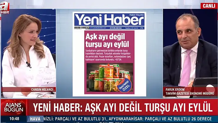 Cansın Helvacı’nın moderatörlüğünde A Haber ekranlarında her sabah yayınlanan Ajans Bugün programının bugünkü konuğu Takvim Gazetesi Ekonomi Müdürü Faruk Erdem oldu. Programda Yeni Haber gazetesinin “Aşk ayı değil, turşu ayı eylül” haberi değerlendirildi.