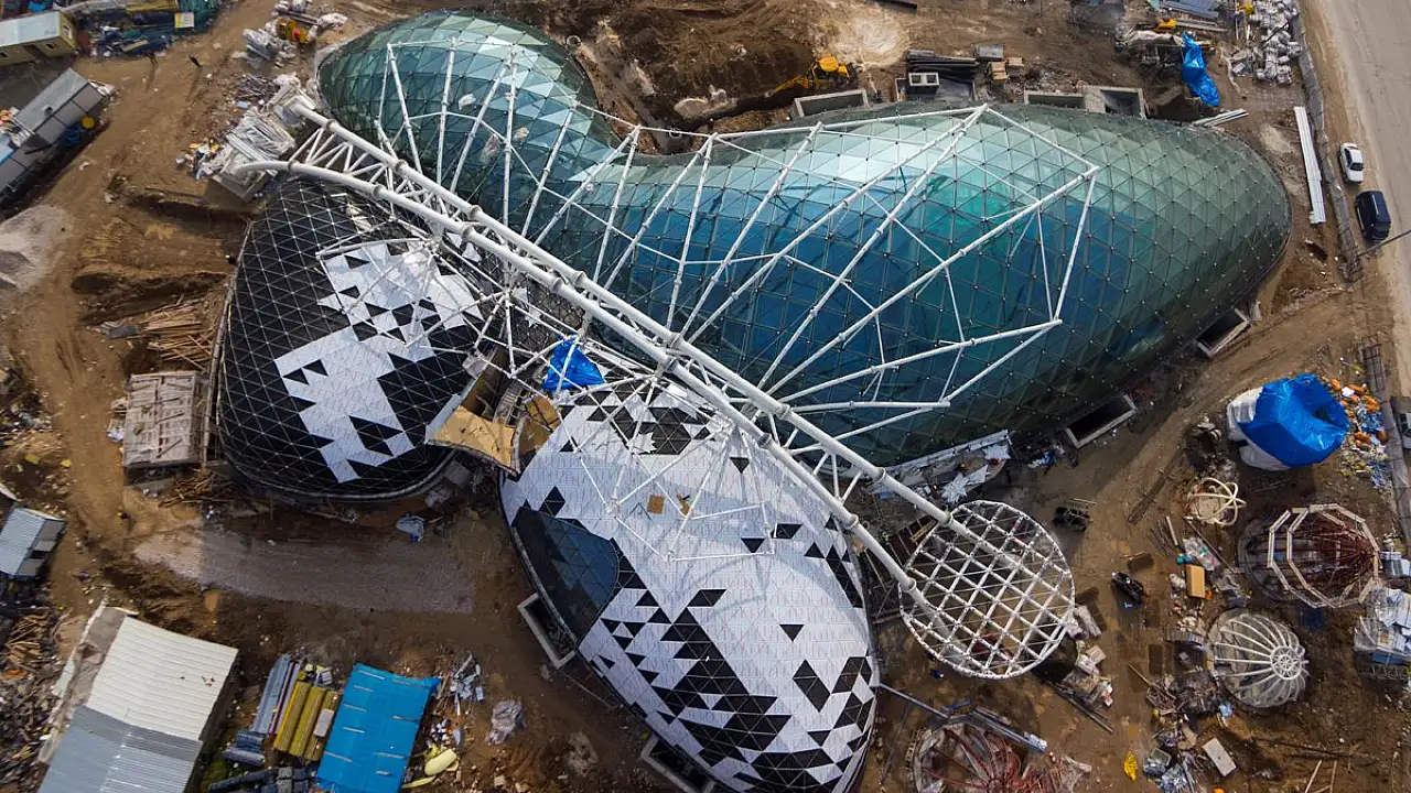 Çelik konstrüksiyon ve cam giydirme cephe kaplama sisteminin tamamlandığı Aşkın Kanatları Müzesi’nde gezinti yolları, yapay dağ ve şelale tamamlanmak üzere. Dış peyzaj çalışmalarının başladığı bahçe kısmına şap atma işlemi tamamlandı, yalıtım işlemlerinin tamamlanmasının ardından tropikal bitkiler için özel karışım toprak ile doldurulacak. Ayrıca teflon membran gölgeliğin montajına da başlandı.