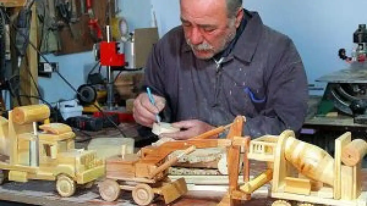 Elazığ'da ahşap oyma yöntemiyle oyuncak iş makineleri üreten 61 yaşındaki Mehmet Hayati Çakır, İkinci Abdülhamid döneminde Yıldız Sarayı'nda marangozluk yapan dedesinin babasından kalma geleneksel el sanatını sürdürüyor.