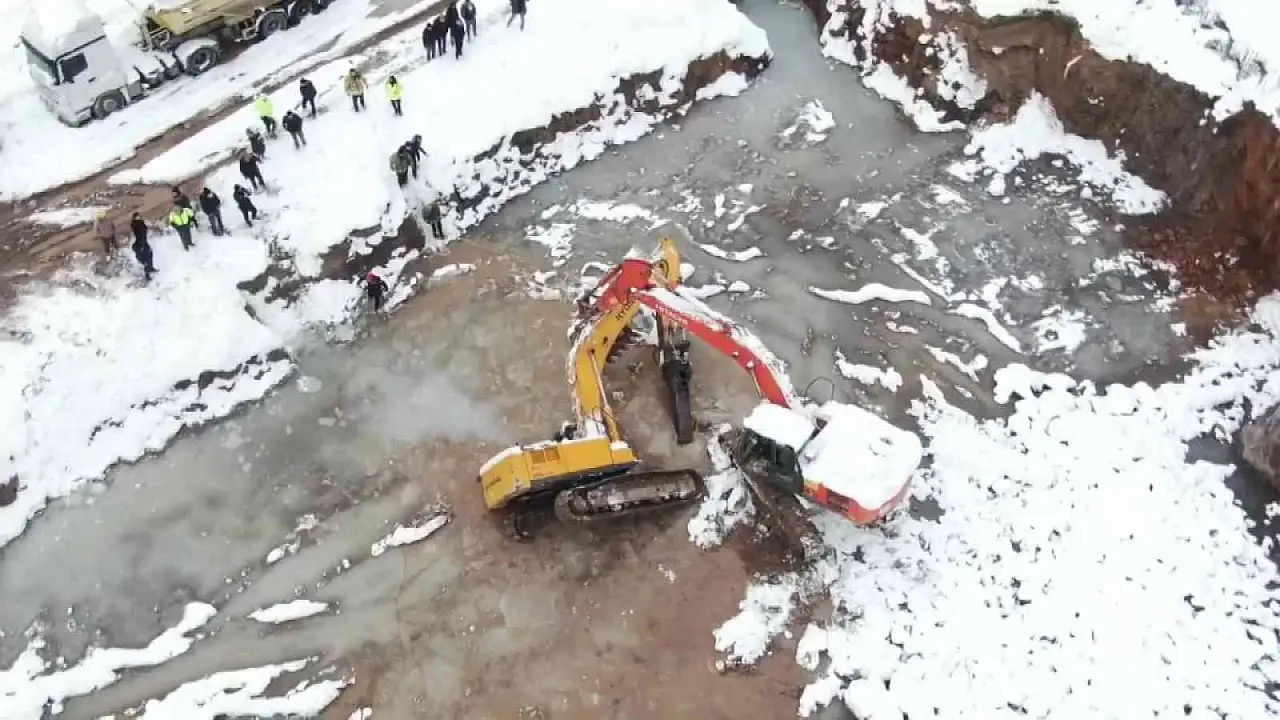 İş makinesinin buz kaplı çukur üzerimde ilerlediği sırada buzun kırılması ve iş makinesinin çukura düştüğü anlar kameraya yansıdı. Görüntülerde iş makinesi buzun üzerinden ilerlediği sırada buzların kırıldığı, iş makinesinin de devrilerek içi su dolu çukura düştüğü görülüyor.