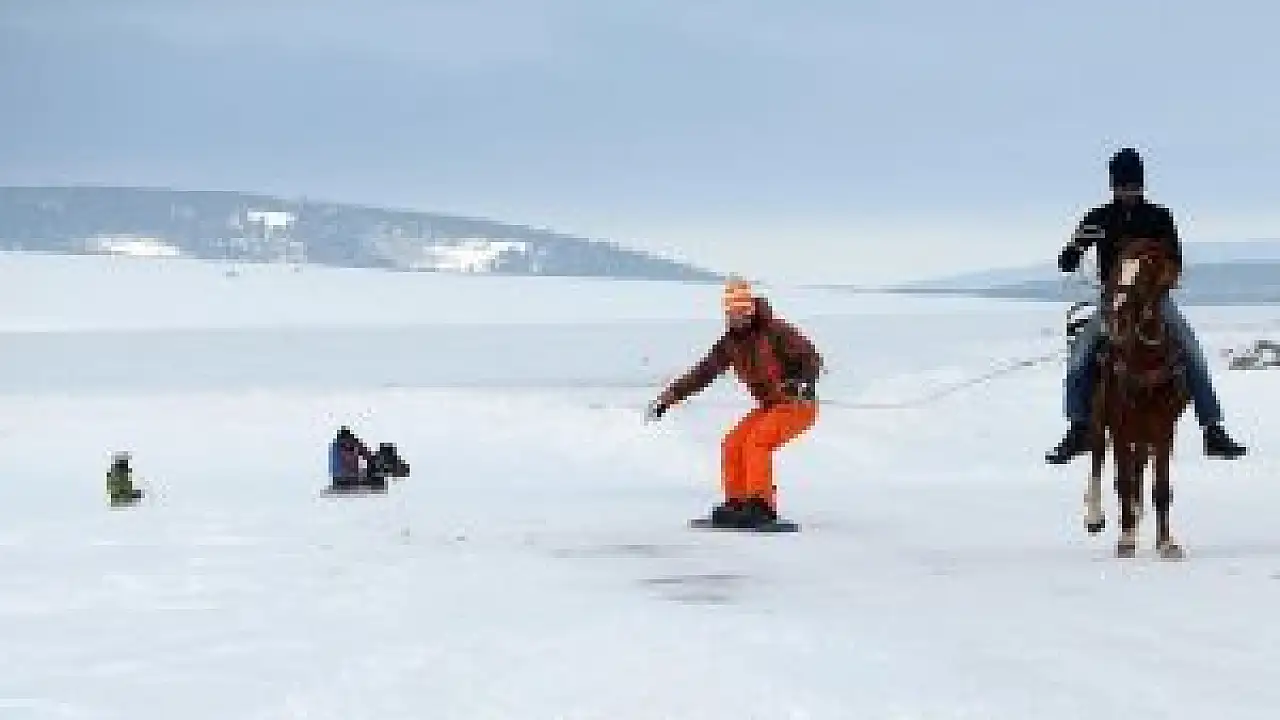 Kars'ın Sarıkamış ilçesinde iki kişi, su kayağına benzer şekilde kar üzerinde ata bağlı ipe tutunarak snowboard yaptı.