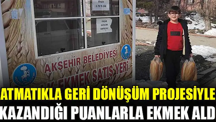 Tarık Buğra İlkokul 2. sınıf Öğrencisi Ali Eren Aslan, 5 litre bitkisel atık yağ ve 5 kilo atık pil biriktirerek Atmatıkla mobil uygulaması ile bildirimde bulunarak belediye ekiplerine atıklarını teslim etti. Vermiş olduğu bu atıkların karşılığı olarak 2 bin puan toplayan Aslan, Akşehir Belediyesi Temizlik İşleri Müdürlüğü'ne gelerek almış olduğu puanlar karşılığında 20 ekmek fişi ödülü kazandı. Atmatıkla Projesi kapsamında 20 ekmek ödülü kazanan Ali Eren Aslan kazanmış olduğu puanlarla ekmek almaktan mutluluk duyduğunu belirterek, atıkları toplamaya devam edip top almak istediğini söyledi.