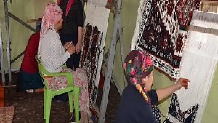 Halk Eğitim Merkezince merkeze 20 kilometre uzaktaki Üzümcü'de açılan ve 5 yıldır süren kilim dokuma kursuna katılan genç kızlar, kök boyasıyla renklendirilen ipleri, dokuma tezgahlarında kilime dönüştürüyor.