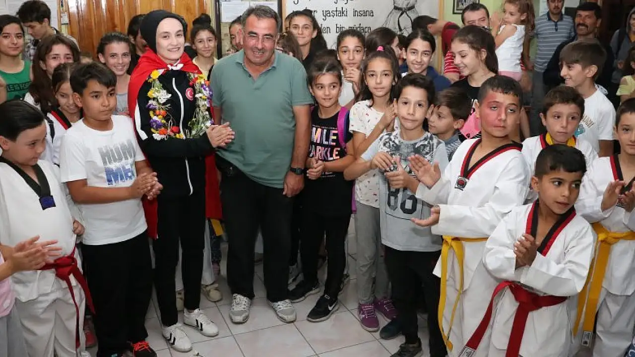 Milli sporcu daha sonra düzenlenen konvoyla ilçede dolaşarak yetiştiği spor salonunun önüne geldi.