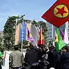 Bir elde HDP bayrağı, diğerinde terörist başının posteri.