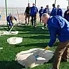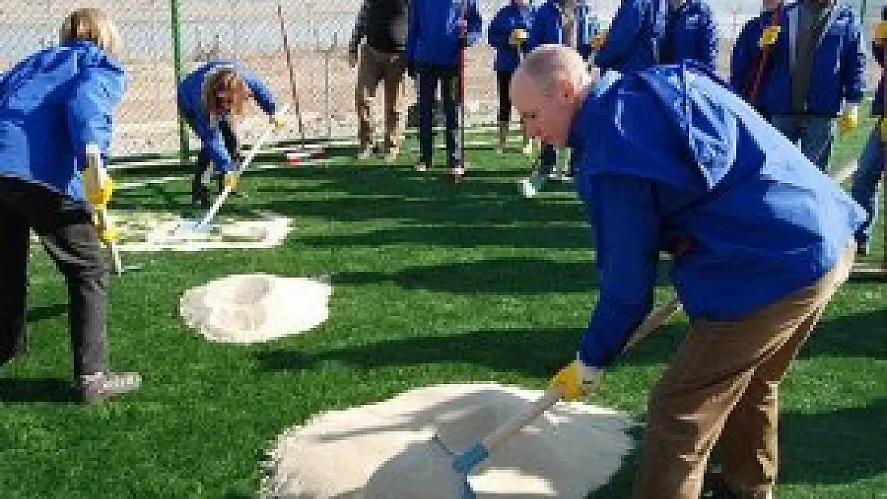 Sırtlarında kum taşıyarak el arabasına boşaltan parlamenterler, aynı zamanda saha içerisinde bulunan çimlere de kum dökerek, direkleri boyadı.