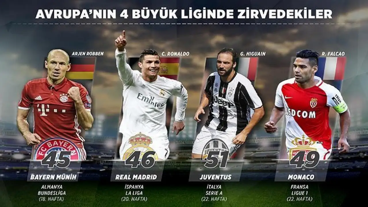 Almanya'da Bayern Münih, İspanya'da Real Madrid, İtalya'da Juventus, Fransa'da ise Monaco haftayı lider kapadı.