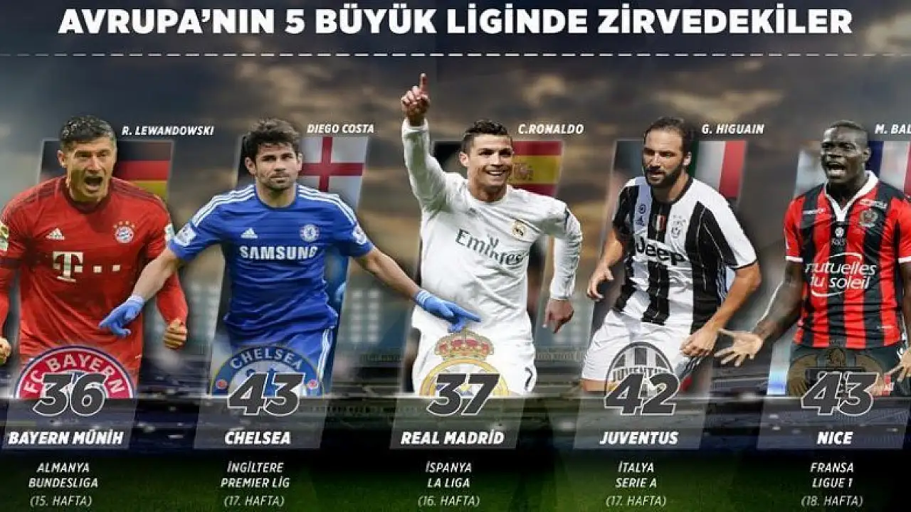 Avrupa'nın en büyük 5 futbol ligi kabul edilen İngiltere (Premier Lig), İspanya (La Liga), Almanya (Bundesliga), İtalya (Serie A) ve Fransa'daki (Ligue 1) karşılaşmalara, hafta sonu devam edildi.