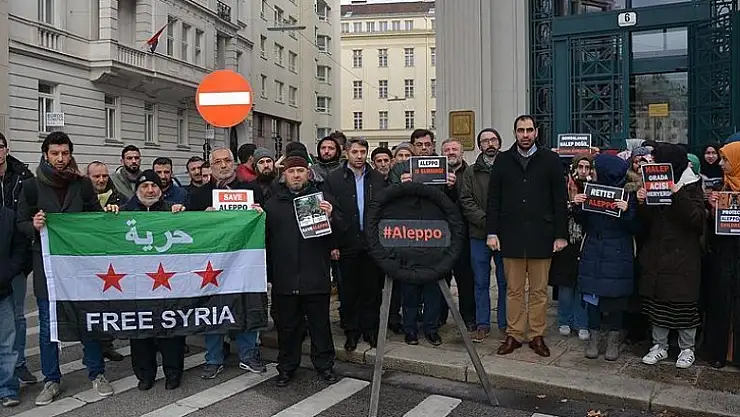 Avusturya’nın başkenti Viyana’da göstericiler, Suriye, İran ve Rusya Büyükelçiliği önünde toplanarak Suriye'nin Halep kentindeki sivillere yönelik saldırıları protesto etti.