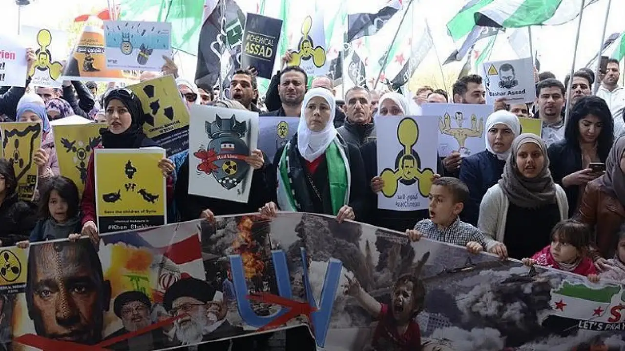 Avusturya'nın başkenti Viyana'da bulunan Birleşmiş Milletler (BM) ofisi önünde toplanan çok sayıda gösterici, Beşşar Esed rejiminin dün İdlib şehrinde kimyasal silah kullanarak işlediği katliamları protesto etti.
