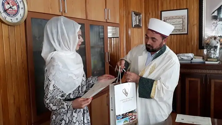 İlçe Vaizi Özbakır, ihtida belgesini verdiği Elif'e dini kitap ve hediye takdim etti.