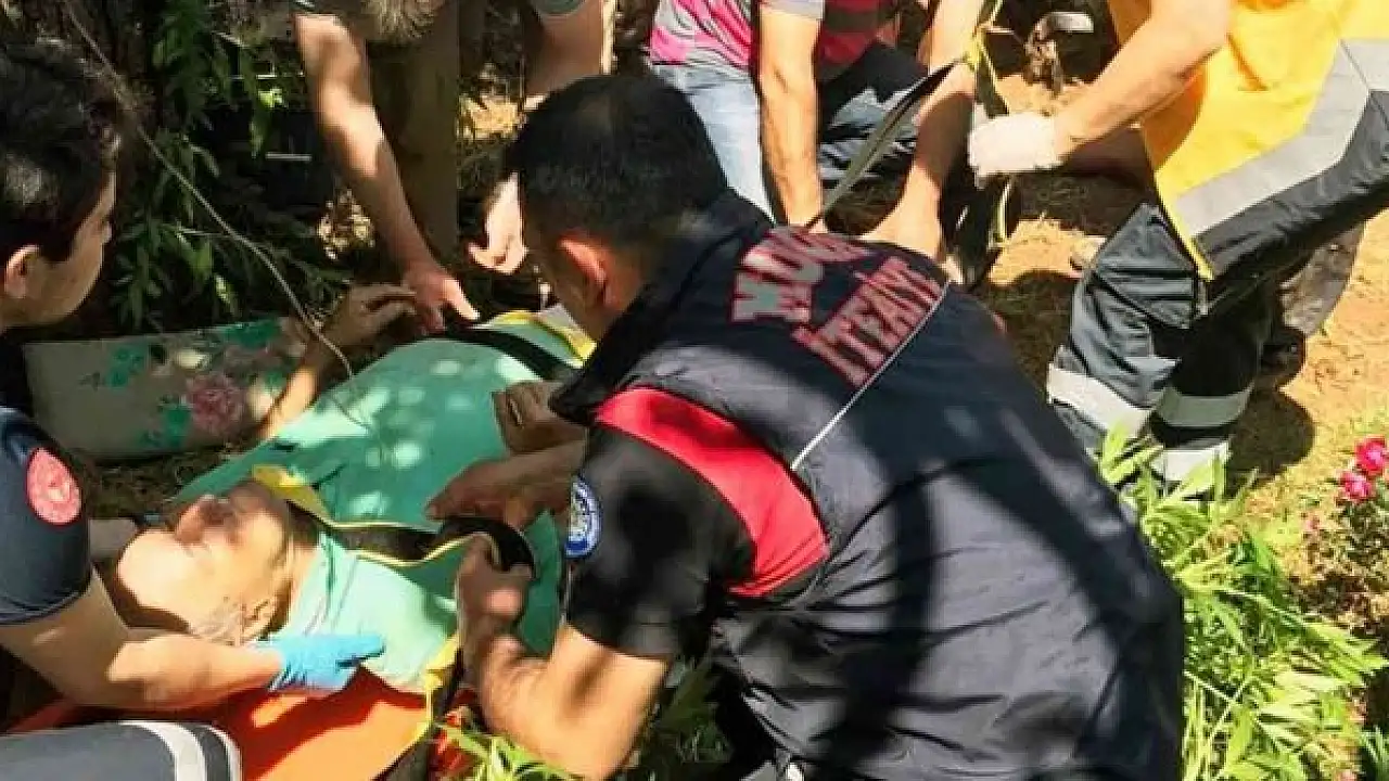 İtfaiye ekipleri vatandaşın ayağını çapa makinesinden kurtardıktan sonra sağlık ekiplerine teslim etti.