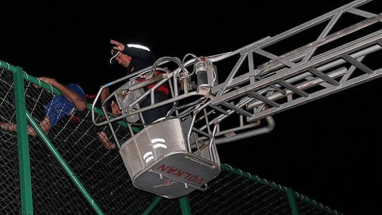 Sivas'ın Şarkışla ilçesinde, halı sahanın tavan filesinde kalan ayakkabısını almak için tırmandığı demir boruların üst kısmında yaklaşık 1 saat mahsur kalan çocuk, itfaiye ekiplerince kurtarıldı.
