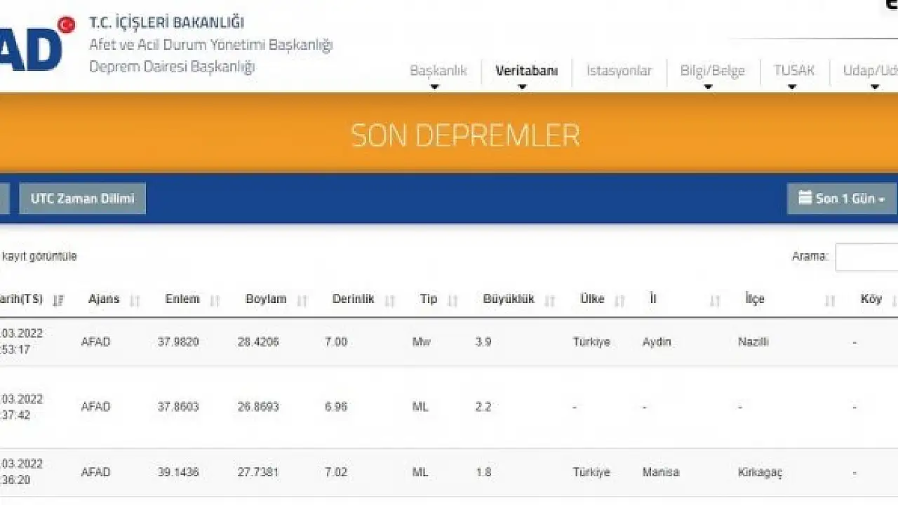 Afet ve Acil Durum Yönetimi Başkanlığı (AFAD) verilerine göre, bugün saat 08.53'te Aydın'ın Nazilli ilçesi merkezli 3.9 büyüklüğünde deprem meydana geldi. Başta Nazilli olmak üzere çevre ilçelerde de hissedilen depremin derinliği 7 kilometre olarak belirlendi. Deprem nedeniyle herhangi bir olumsuzluk yaşanmadığı öğrenildi.