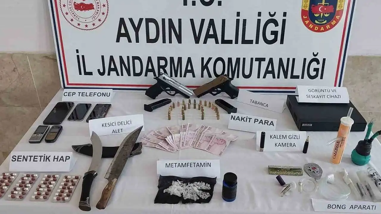Aydın İl Jandarma Komutanlığı, Kaçakçılık ve Organize Suçlarla Mücadele ekiplerimizce uyuşturucu madde satan şahsa yönelik çalışma gerçekleştirildi. Nazilli ilçesinde 2 şahsa yönelik ikametinde uyuşturucu madde köpeği ile yapılan aramada, 2 adet 9 mm çapında tabanca, 2 adet şarjör, 33 adet 9 mm çapında tabanca fişeği, 2 adet kesici alet, 35 gram metamfetamin, 96 kapsül sentetik ecza, 9 adet uyuşturucu içme aparatı, 5 adet cep telefonu, görüntü ve ses kayıt cihazı, kalem görünümlü gizli kamera, Uyuşturucu Ticaretinden elde edildiği değerlendirilen 2 bin 400 TL para ele geçirildi. Yakalanan şüpheliler hakkında adli sürecin devam ettiği öğrenildi.