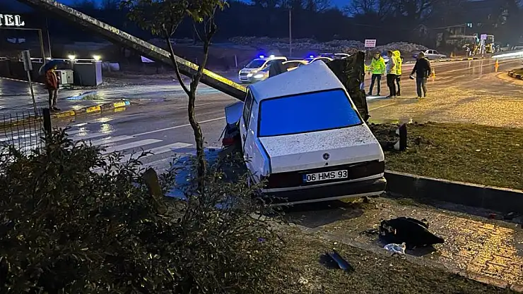Aydınlatma direğine çarpan otomobil ikiye bölündü