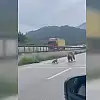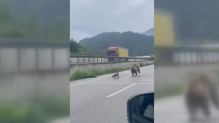 Cep telefonu görüntülerinde, trafik akışının olduğu yoldan yavrularını kurtarmaya çalışan ve korktuğu anlaşılan anne ayının sıçrayarak üst yola çıktığı, diğer yavrunun da üst yolda olduğu görüldü.