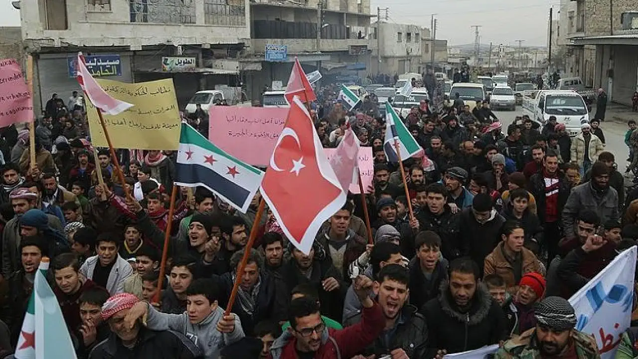 Fırat Kalkanı Harekatı ile terörden temizlenen Bab ilçe merkezinde yaşamaya başlayan Tadifli göçmenler, gösteride rejim karşıtı slogan attı.