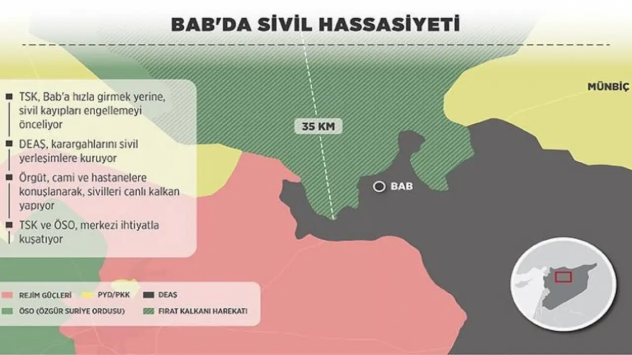 Fırat Kalkanı Harekatı'nda Bab'ı terör örgütü DEAŞ'tan kurtarmak için operasyon yürüten Türk Silahlı Kuvvetleri (TSK) ve Özgür Suriye Ordusu, ilçeyi hızla ele geçirme stratejisi yerine sivil kayıpların önüne geçme önceliğini gözetiyor.