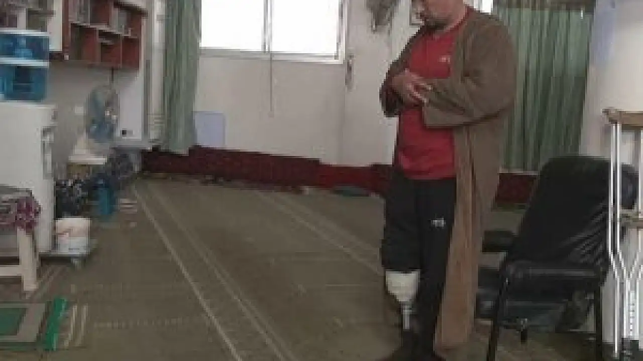 "6 ay önce camiden çıkarken patlayan bir bombanın şarapnelleriyle yaralandım. Şarapneller iltihap yaptı. Gezici hastaneye gittim. Ayağımı kestiler. Ayağımı kaybetsem de sağlıma kavuşur kavuşmaz tüm tehlikelere rağmen işime geri döndüm. Protez takılmadan önce namazları oturarak kıldırıyordum. Bir buçuk ay önce ise Dera’da bir protez merkezine gidip ayağıma geçici protez taktırdım. Sonra da namazları ayakta kıldırmaya başladım. Şimdi daha uygun bir proteze kavuşmayı bekliyorum."