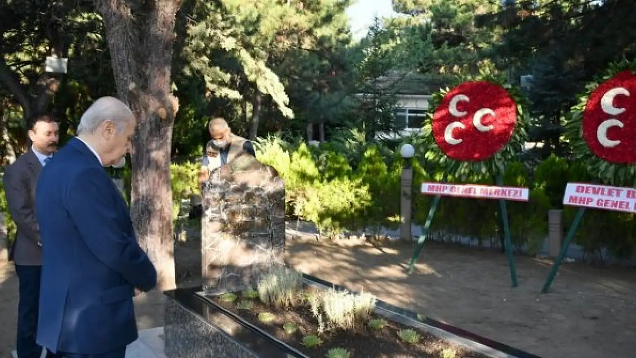 Merhum Alparslan Türkeş'in Beştepe'deki mezarını ziyaret eden Bahçeli, Türkeş'in kabrine kırmızı ve beyaz karanfiller bıraktı, bakır ibrikle su döktü.