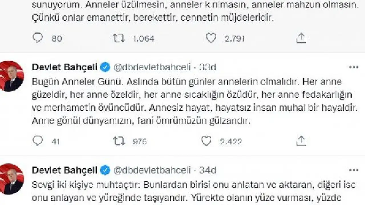 MİLLİYETÇİ Hareket Partisi (MHP) Genel Başkanı Devlet Bahçeli, 'Her anne güzeldir, her anne özeldir, her anne sıcaklığın özüdür, her anne fedakarlığın ve merhametin övüncüdür. Anne gönül dünyamızın, fani ömrümüzün gülzarıdır' dedi.