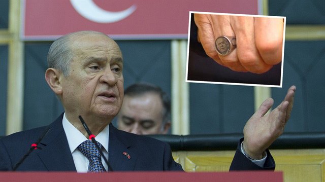 MHP lideri Devlet Bahçeli, Anadolu Selçuklu ve Osmanlı Devleti armalı ve ay yıldızlı yüzüğüyle de gündeme gelmişti. MHP Lideri Bahçeli’nin grup toplantısında taktığı yüzük dikkat çekti.