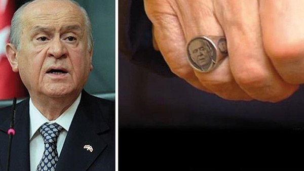 Zaman zaman tasarımlarını kendisinin yaptığı yüzükler takan Bahçeli’nin bu kez üzerinde kendi fotoğrafının işlendiği yüzüğü taktığı görüldü.