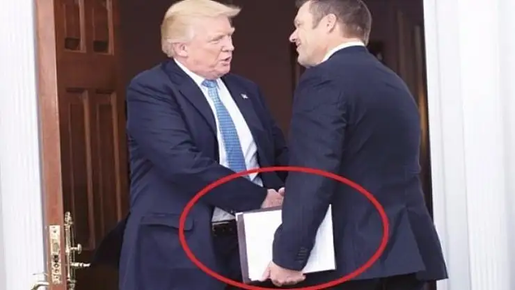 planı şeffaf bir dosyada yanında taşıdı. İkili, basına poz verirken, AP fotoğrafçısının çektiği fotoğraflarda Kobach’ın elindeki kağıtlarda neler yazıldığı açıkça görüldü.
