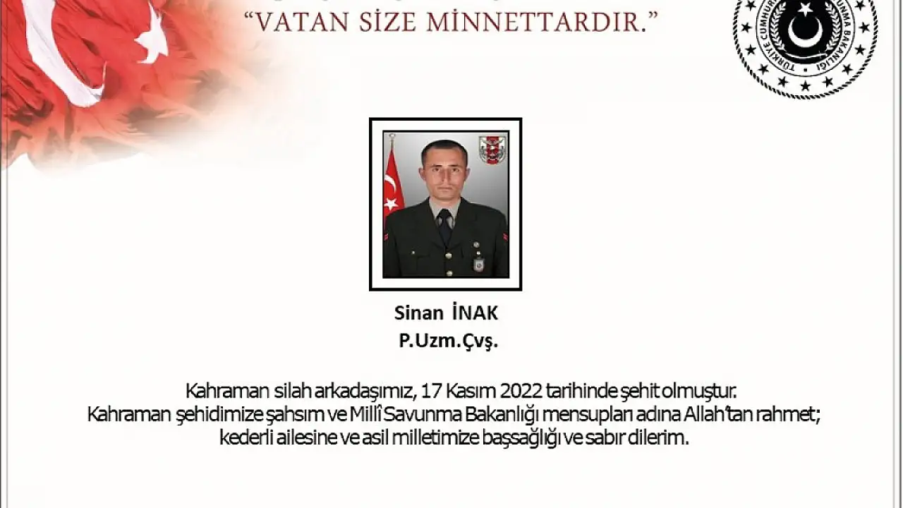 Bakanlıktan yapılan yazılı açıklamada, "Pençe-Kilit Operasyonu bölgesinde, 17 Kasım 2022 tarihinde, bölücü terör örgütü mensupları tarafından açılan taciz ateşi sonucu, kahraman silah arkadaşımız Piyade Uzman Çavuş Sinan İnak şehit olmuştur. Bizleri derin bir acı ve üzüntüye boğan bu olayda hayatını kaybeden aziz şehidimize Allah'tan rahmet; kederli ailesine, Türk Silahlı Kuvvetleri ile asil milletimize başsağlığı ve sabır dileriz" denildi.
