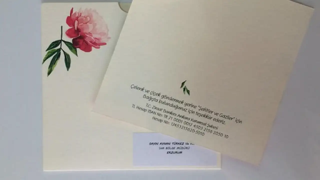 Gönderilen davetiyenin arka kısmında "çelenk ve çiçek göndermek yerine şehitler ve gaziler için bağışta bulunduğunuz için teşekkür ederiz." yazısı yer aldı.
