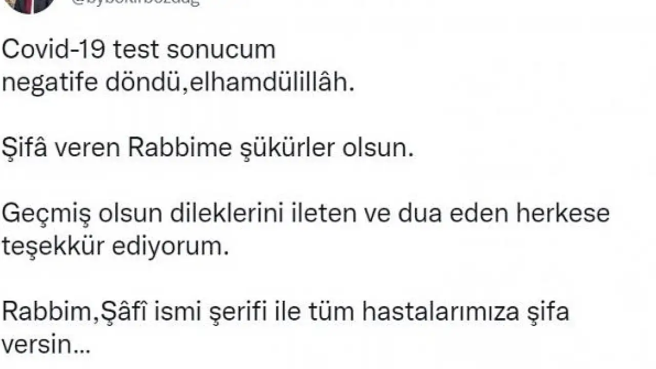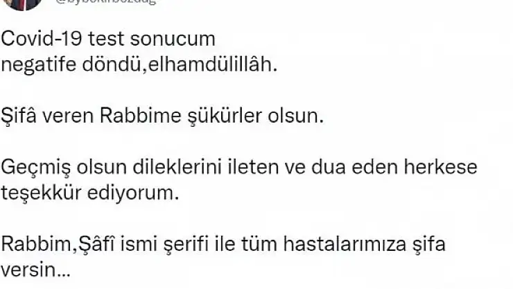 Bakan Bozdağ, Twitter hesabından yaptığı açıklamada, "Covid-19 test sonucum negatife döndü, elhamdülillah. Şifa veren Rabbime şükürler olsun. "Geçmiş olsun" dileklerini ileten ve dua eden herkese teşekkür ediyorum. Rabbim, Şafi ismi şerifi ile tüm hastalarımıza şifa versin" dedi.