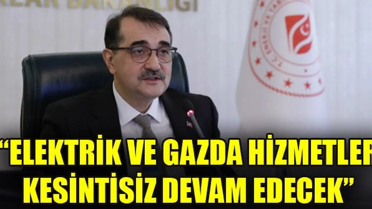 Enerji ve Tabii Kaynaklar Bakanı Fatih Dönmez, vatandaşların evde kaldıkları süre boyunca elektrik ve doğal gaz hizmetlerinin Cumhurbaşkanı Recep Tayyip Erdoğan'ın talimatlarıyla kesintisiz ve güvenli şekilde devam edeceğini söyledi.